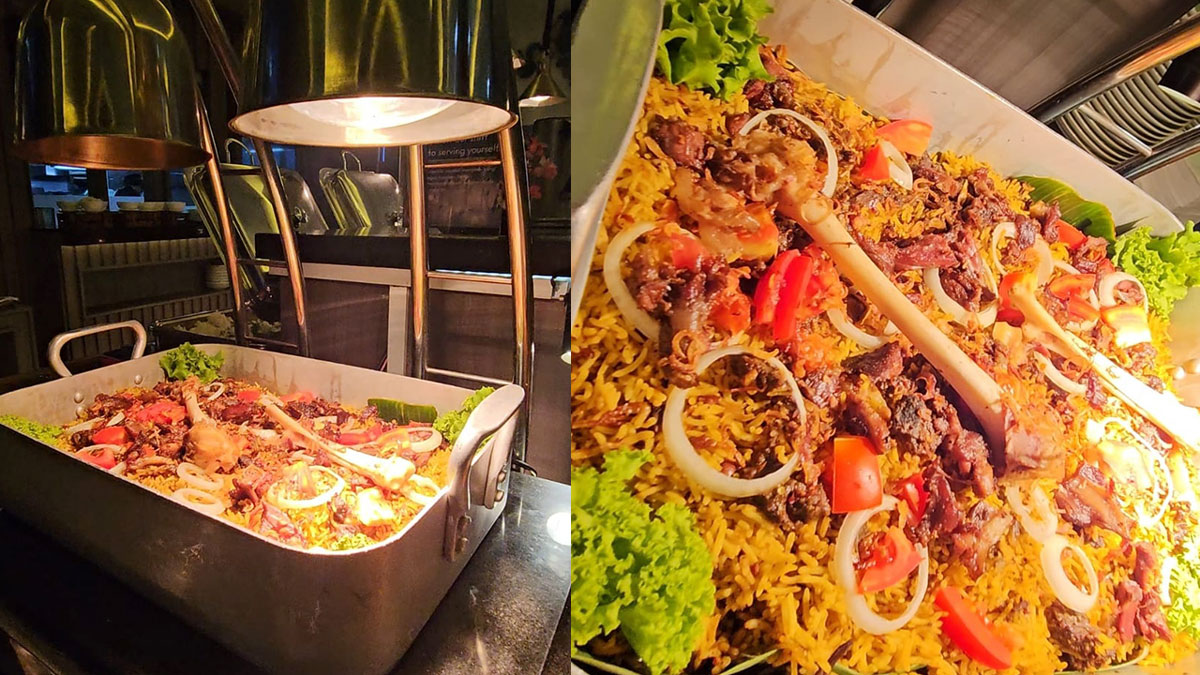 Mendekati meja buffet, nasi briyani kambing langsung terlihat di bagian depan area carving. Posisinya seolah menyambut tamu sebelum mereka bergerak menjelajahi menu lainnya.