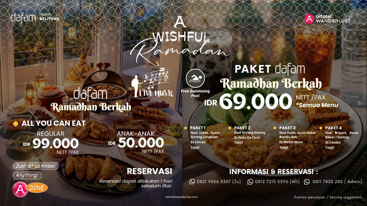 SIJUK, BELITONGEKSPRES.CO.IDDafam Resort Belitung menghadirkan promo spesial berbuka puasa bersama (bukber) bertajuk A Wishful Ramadan 2026 dengan pilihan paket iftar hemat hingga makan sepuasnya.