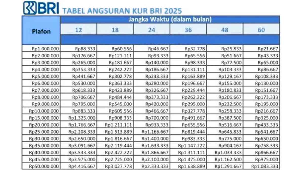 BACA JUGA:Tabel Angsuran Pinjaman KUR BRI 2025 Plafon Rp100–500 Juta, Berikut Syarat & Cara Pengajuan