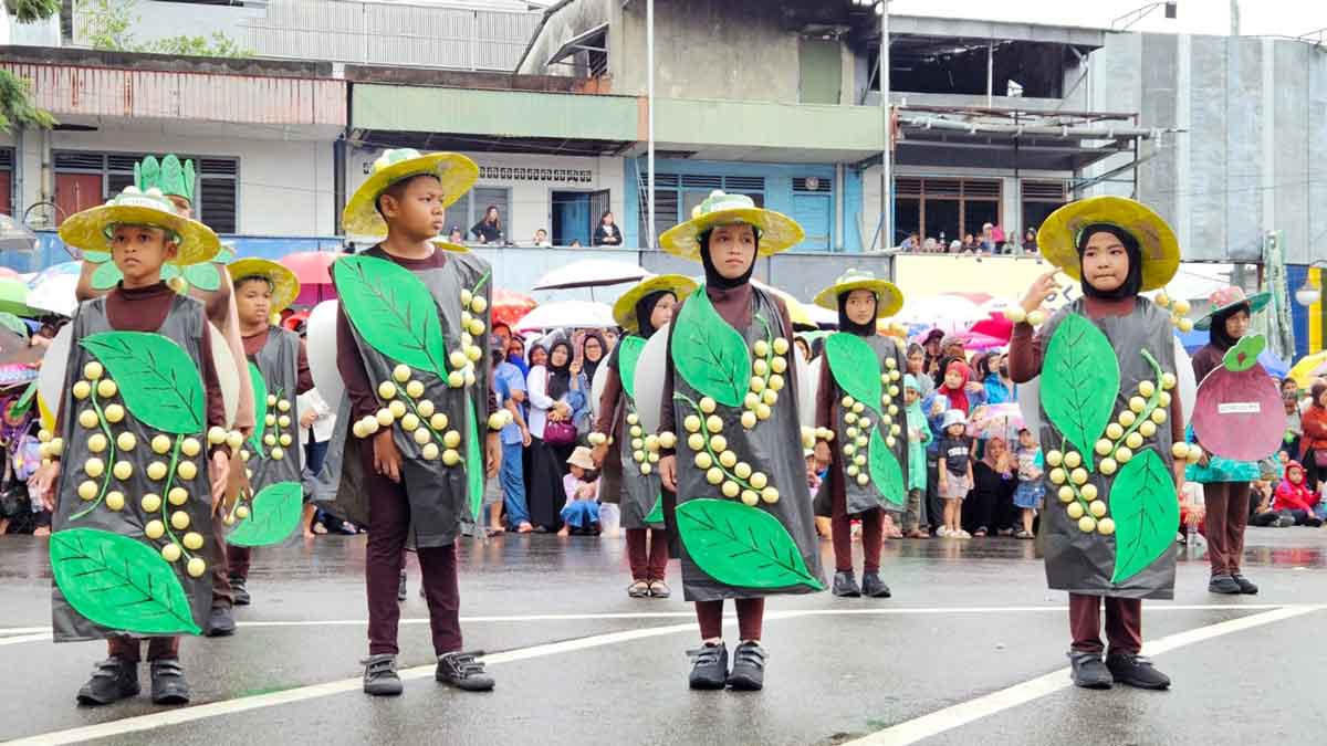 Pawai Pembangunan Belitung 2025: Peserta SD Negeri 30 Tanjungpandan yang menampilkan keberagaman inovasi memperkuat ketahanan ekonomi inklusif-Yudiansyah/BE-